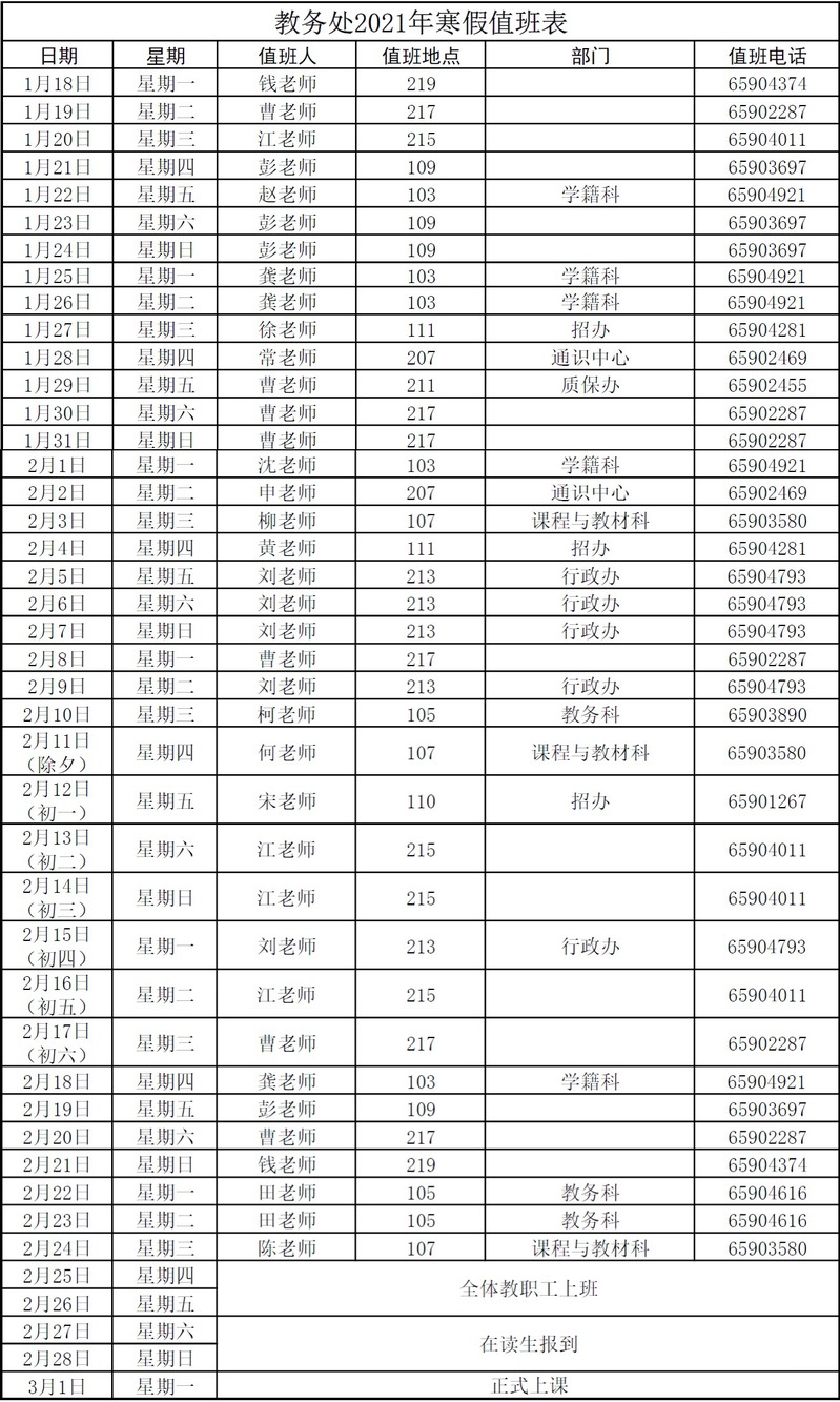 根据学校工作安排,教务处自2021年1月18日起至2月24日安排轮休,2月25日起正常上班。轮休期间安排专人值班,教务处对外服务时间如下: