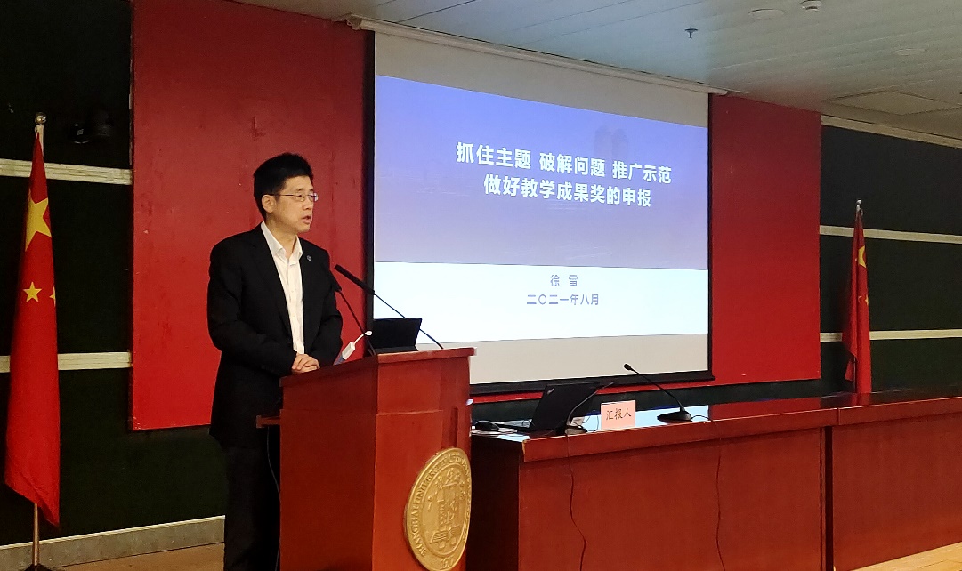 徐雷教授的专题讲座紧紧围绕着抓住主题、破解问题、推广示范三个方面层层深入,抽丝剥茧。他抛出了“什么是教学成果奖”、“哪些是专家容易认可的成果”、“如何准备一份好的教学成果奖?”等一系列问题,引导与会教师更深刻、更清晰地认识和思考教学成果奖。他指出,要准备一份好的教学成果奖必须要回答是教学问题还是工作问题、是某个学校某门课的问题还是带有普适性的问题、起始时间的标志性意义何在、解决问题办法的独创性是什么等问题,同时要做好前期调研工作,了解清楚同类型项目国内其他高校的教学情况,以及同类工作获得教学成果奖的情况等,并通过优秀的获奖项目与不太成功的案例分析对比,让与会者进一步认清什么才是一个好的教学成果,以及如何做好教学成果奖的申报。最后,徐雷副校长强调,教学成果奖申报一定要谋划在前,始终要把培养效果作为检验成果的第一标准。