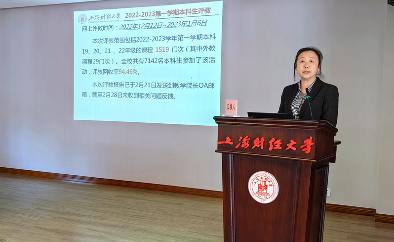 教务处曹晓霞副处长针对2022-2023学年第一学期本科生评教、各学院听课情况、审核评估专家推荐等工作进行了通报,并向与会人员进行了2022-2023学年第二学期的听课提醒,进一步落实听课任务。随后,她重点就“十四五”期间普通高等学校本科教育教学审核评估工作的通知要求以及2023年本科教学质量评估工作进行了说明与布置。